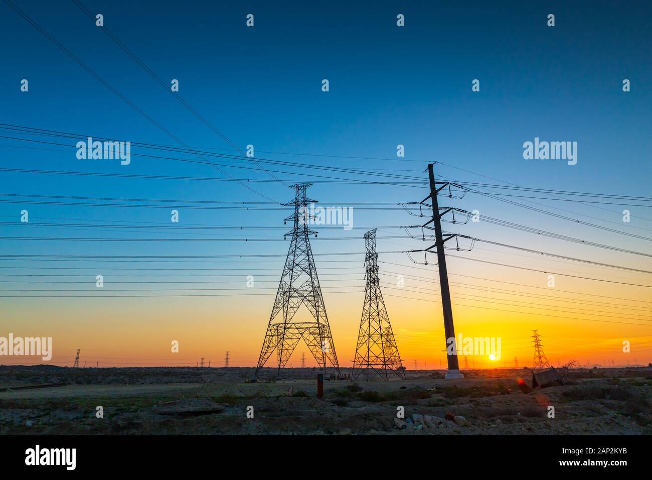 High Voltage Electric Tower On Sunrise Time Near Al Hofuf Saudi